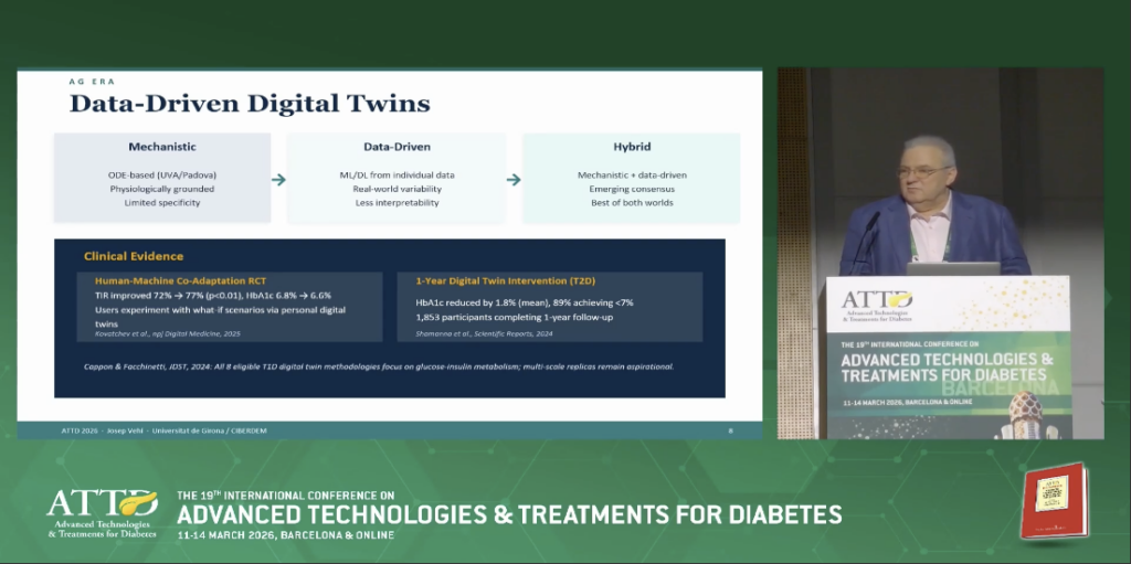 Silnou témou boli aj tzv. digitálne dvojičky, teda digitálne modely pacienta, ktoré využívajú reálne dáta (CGM, inzulín, správanie, dáta z hodiniek, atp.) na simuláciu metabolizmu a umožňujú testovať rozhodnutia vopred. Prvé klinické dáta ukazujú zlepšenie time-in-range aj pokles HbA1c, čo naznačuje, že sa posúvame smerom k skutočne personalizovanej liečbe, kde odporúčania nebudú generické, ale „ušité na mieru“ konkrétnemu pacientovi.