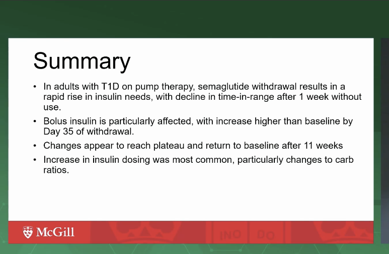 Z praktického pohľadu boli veľmi cenné aj dáta o GLP-1 liečbe u pacientov s T1D. Po vysadení semaglutidu (Ozempic) dochádza k rýchlemu nárastu potreby inzulínu, poklesu time-in-range a výrazným zmenám najmä v bolusových dávkach. Pri tirzepatide (Mounjaro) sa objavil signál vyššieho výskytu diabetickej retinopatie, pričom kľúčovým vysvetlením je známy fenomén, že rýchly pokles HbA1c môže viesť k prechodnému zhoršeniu retinopatie, čo zdôrazňuje potrebu opatrnosti a pravidelných očných kontrol.