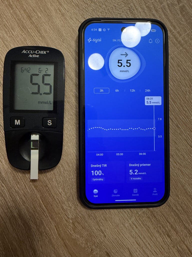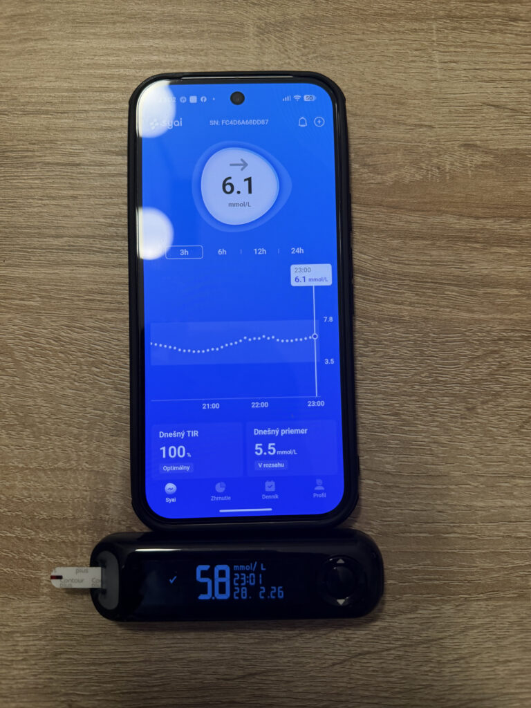 Po zavedení senzora Syai som sa opakovane stretával s tým, že senzor meral presne okamžite po zahriatí, ktoré trvá 30 minút — a 14-dňová životnosť začína až po tomto intervale. U iných výrobcov je bežné čakať 12–24 hodín, kým sa senzor stabilizuje, pričom toto zahriatie považujú za súčasť životnosti senzora. Syai ju naopak počíta až od momentu, keď je senzor pripravený merať.